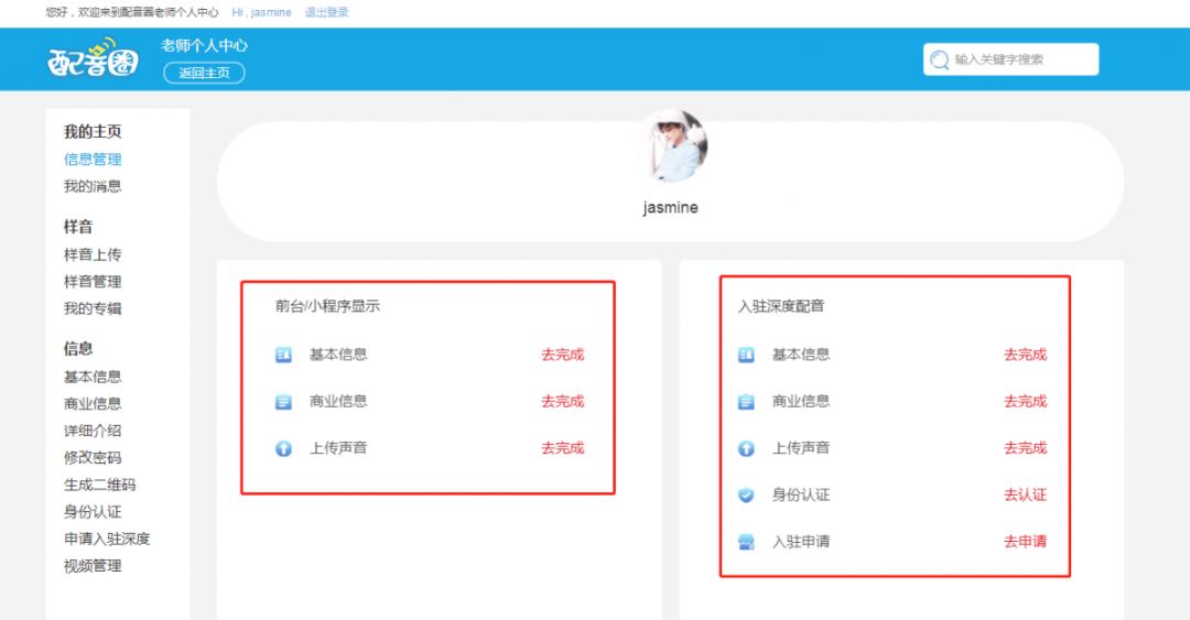 完善“基本信息”、“商业信息”、“上传声音”,就注册成功了!